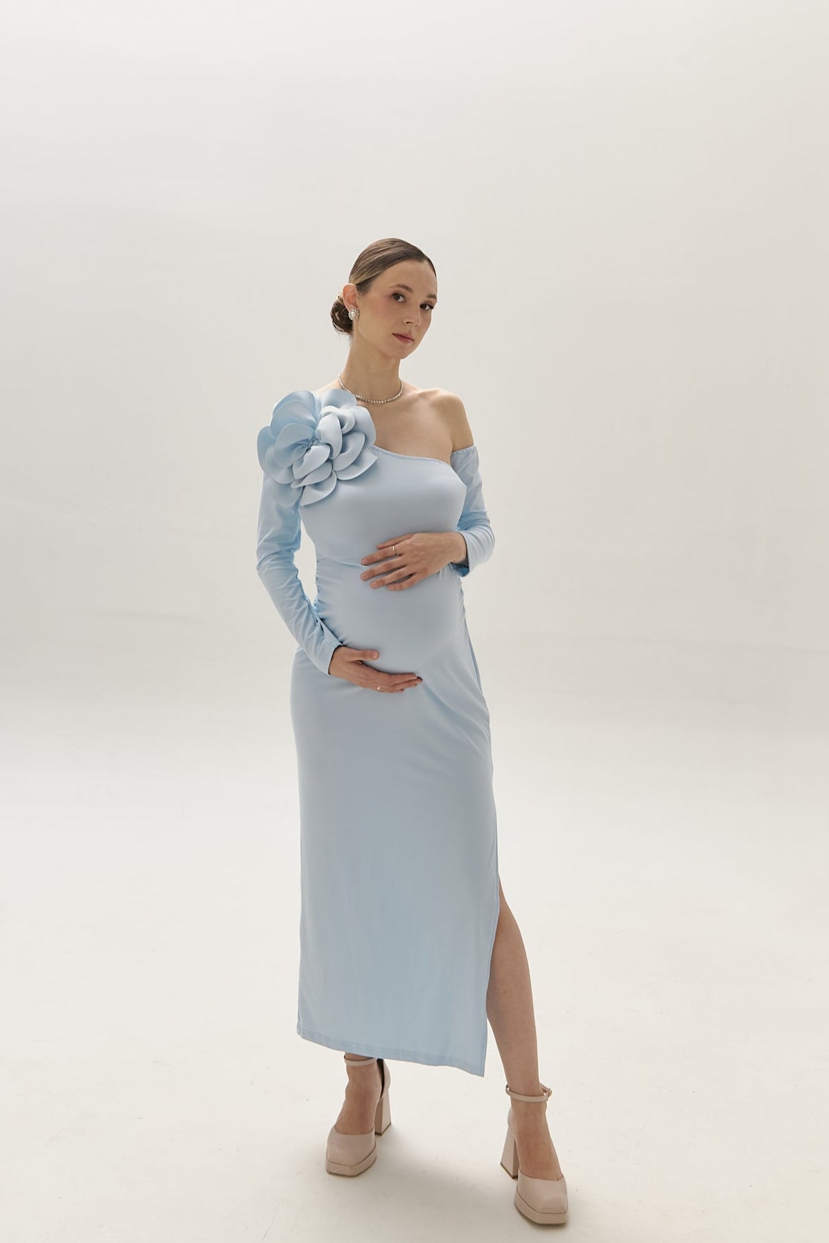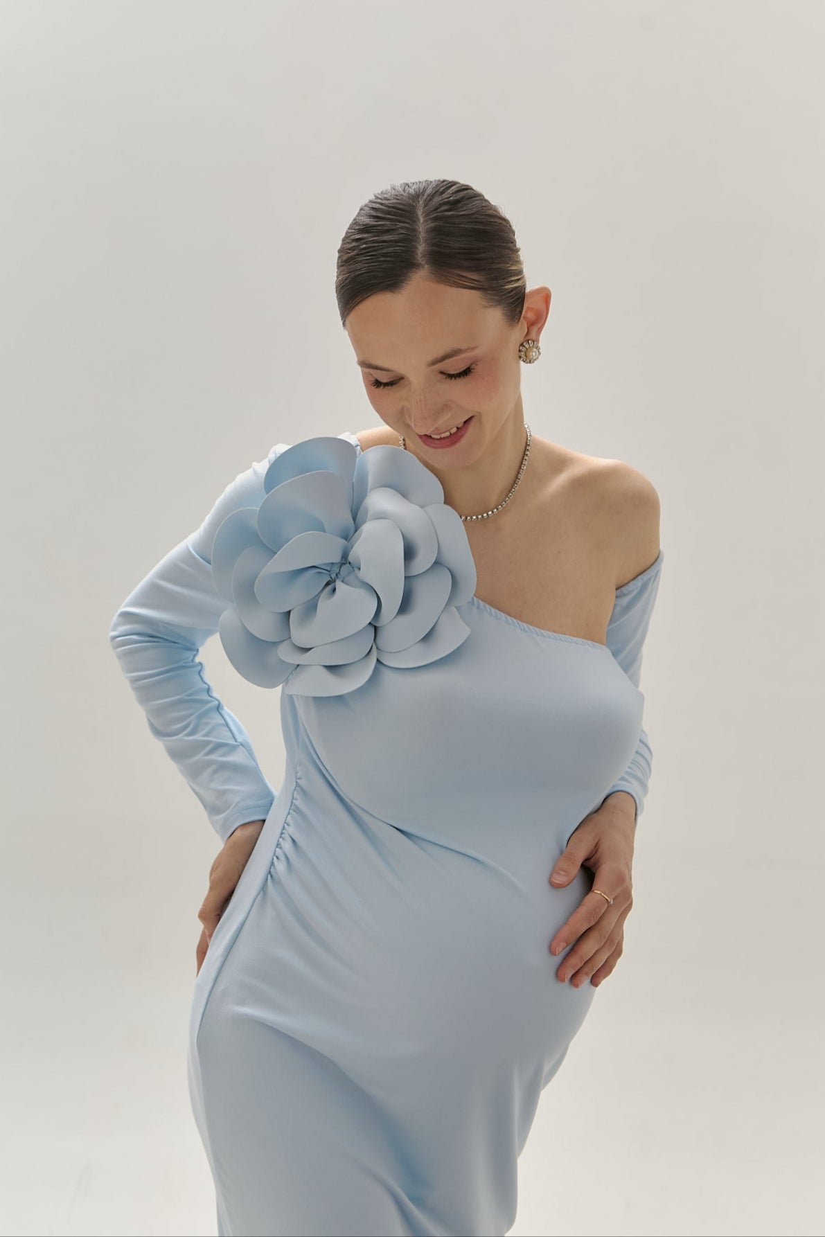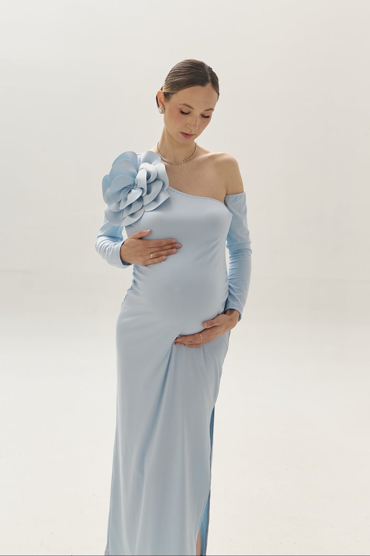 Camelia to wyjątkowo elegancka suknia ciążowa, stworzona z myślą o przyszłych mamach ceniących styl i luksus. Klasyczny, dopasowany krój oraz długość midi delikatnie podkreślają sylwetkę, a efektowne rozcięcie dodaje kobiecości. Wyjątkowym elementem jest imponujący kwiatowy detal na ramieniu, który przyciąga wzrok i nadaje kreacji niepowtarzalnego charakteru. Idealna na wyjątkowe okazje, takie jak baby shower, eleganckie przyjęcia i sesje fotograficzne.
