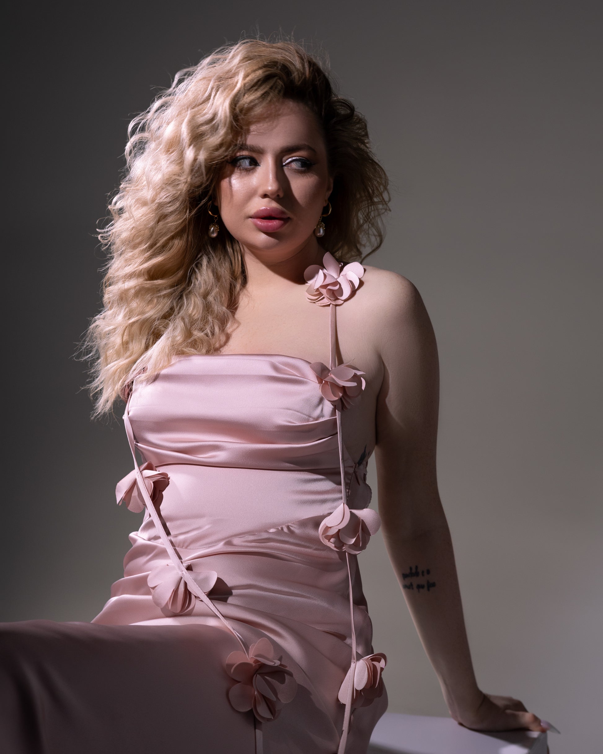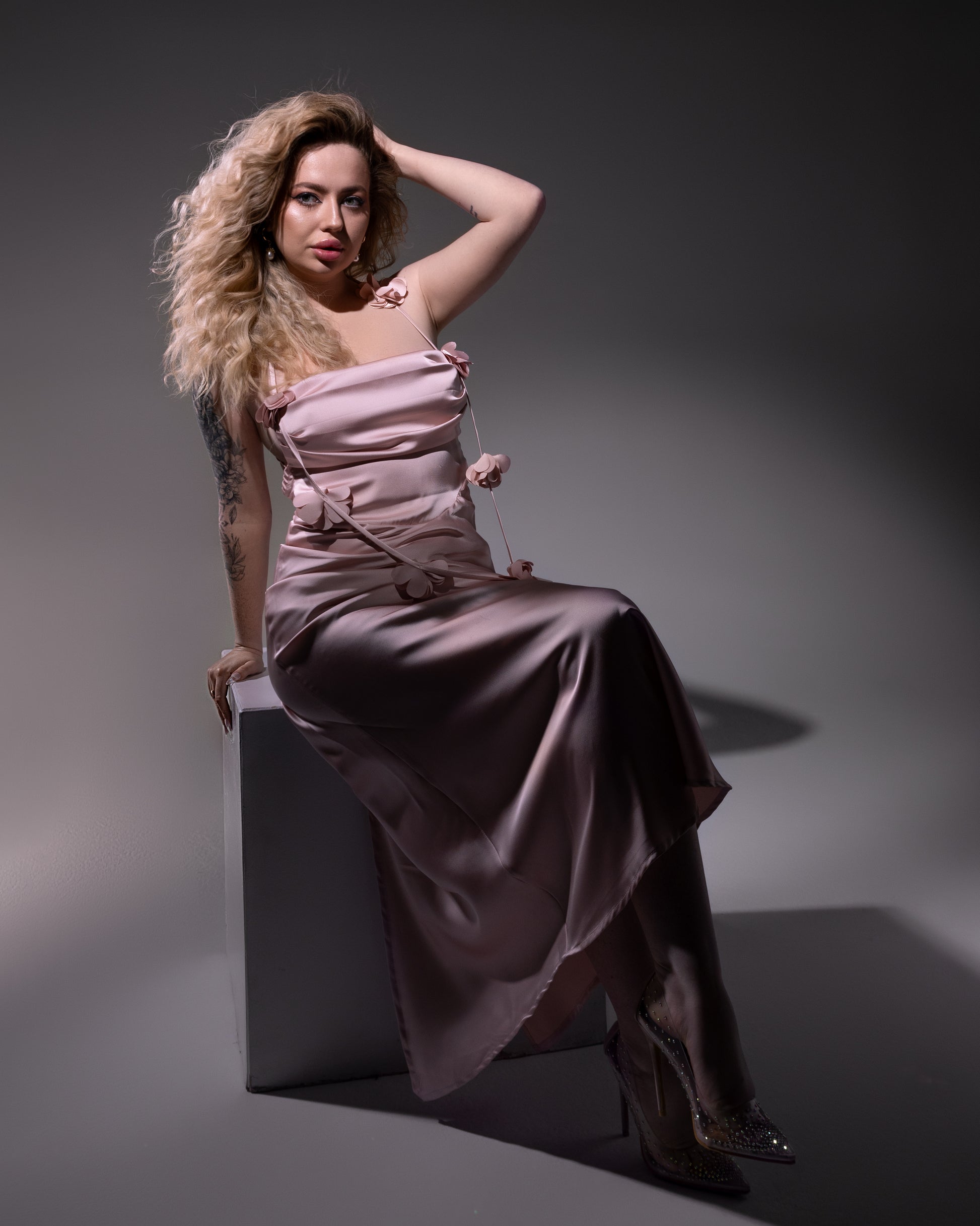Sukienka Rose w subtelnym odcieniu różu, wykonana z miękkiej satyny. Romantyczne kwiatowe zdobienia nadają jej lekkości i wdzięku. Idealna na wesele, przyjęcia i romantyczne sesje zdjęciowe.
