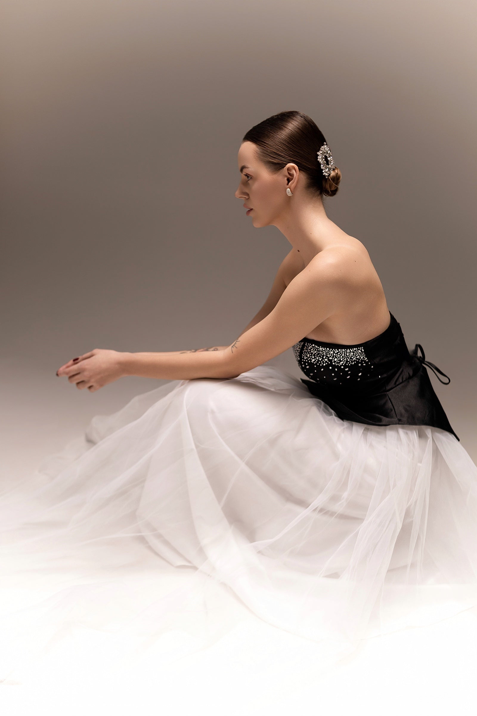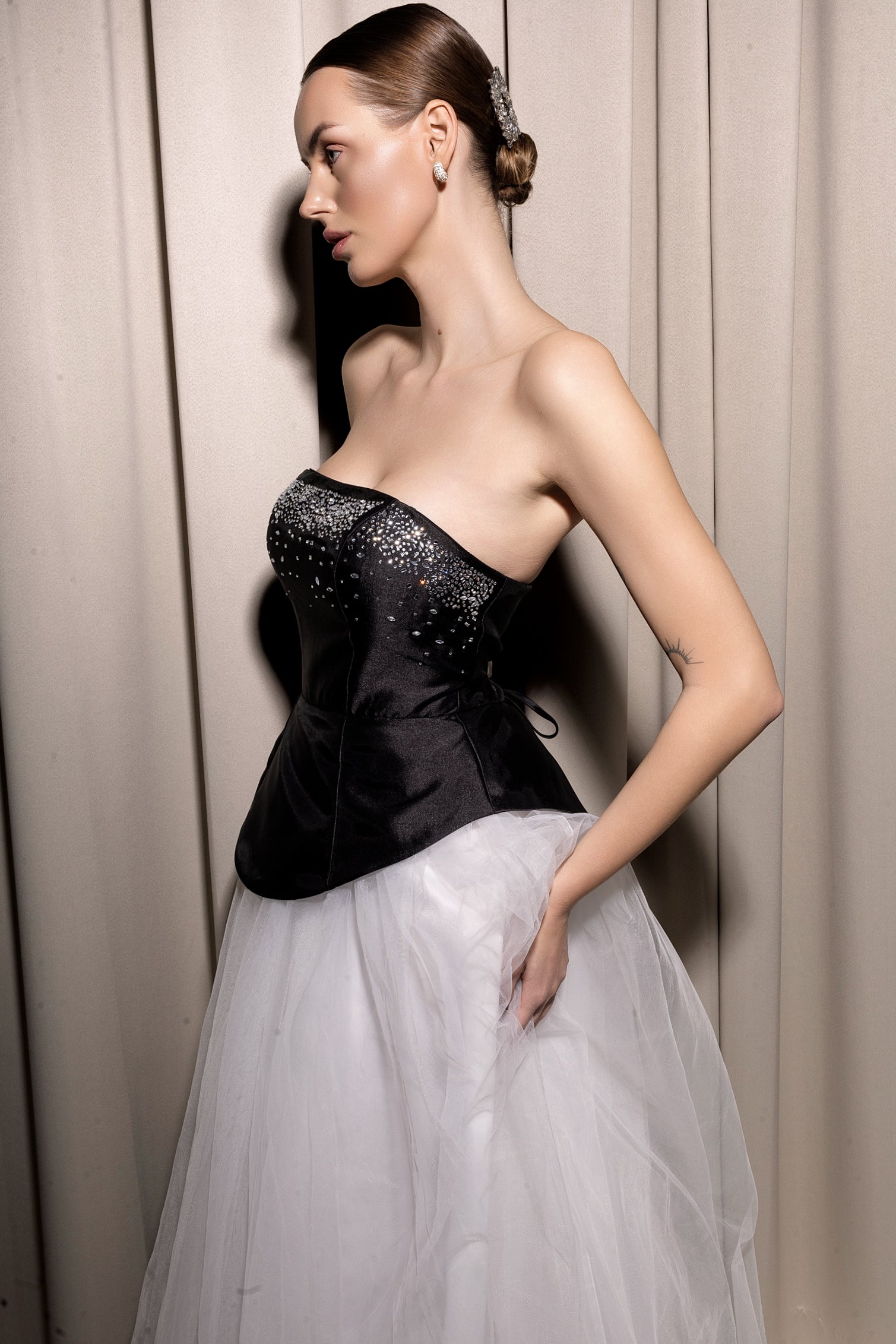 Elegancja i kontrast spotykają się w tej wyjątkowej sukni balowej, która łączy klasykę czerni z subtelną lekkością bieli. Gorset w odcieniu głębokiej czerni, ozdobiony delikatnymi kryształkami, podkreśla talię i nadaje stylizacji nowoczesnego charakteru. Jego unikalny krój nawiązuje do stylu gorsetowego, dodając sylwetce wyrazistości i klasycznego wdzięku.