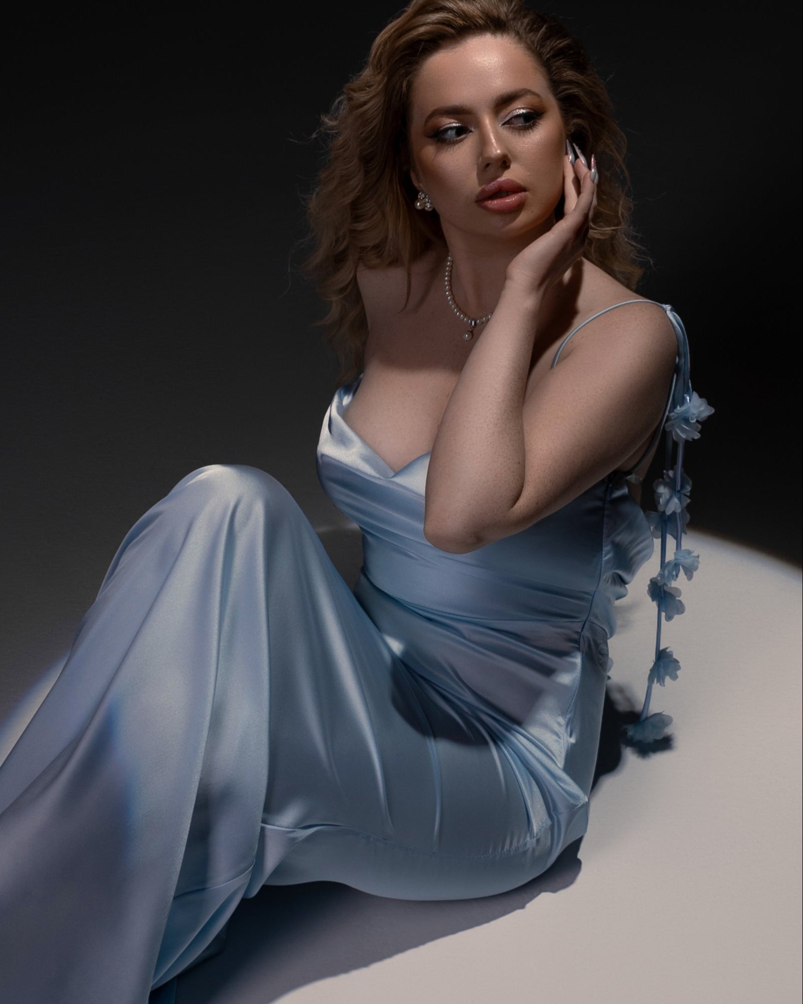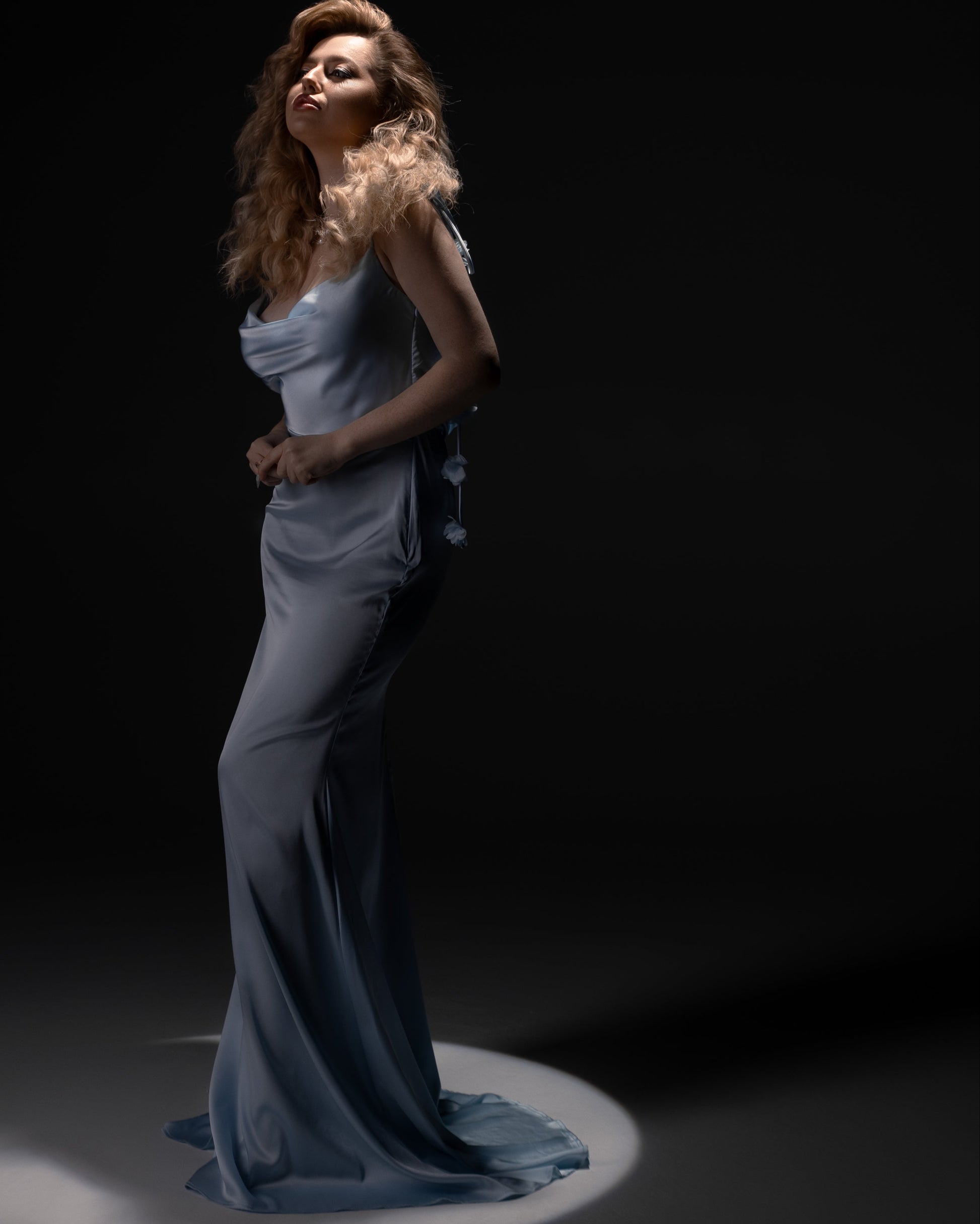 Sukienka Sky to błękitna, długa kreacja o eleganckim kroju z głębokim wycięciem na plecach. Lekki materiał doskonale układa się na sylwetce, podkreślając kobiece kształty. Idealna na uroczystości, sesje zdjęciowe czy bale.