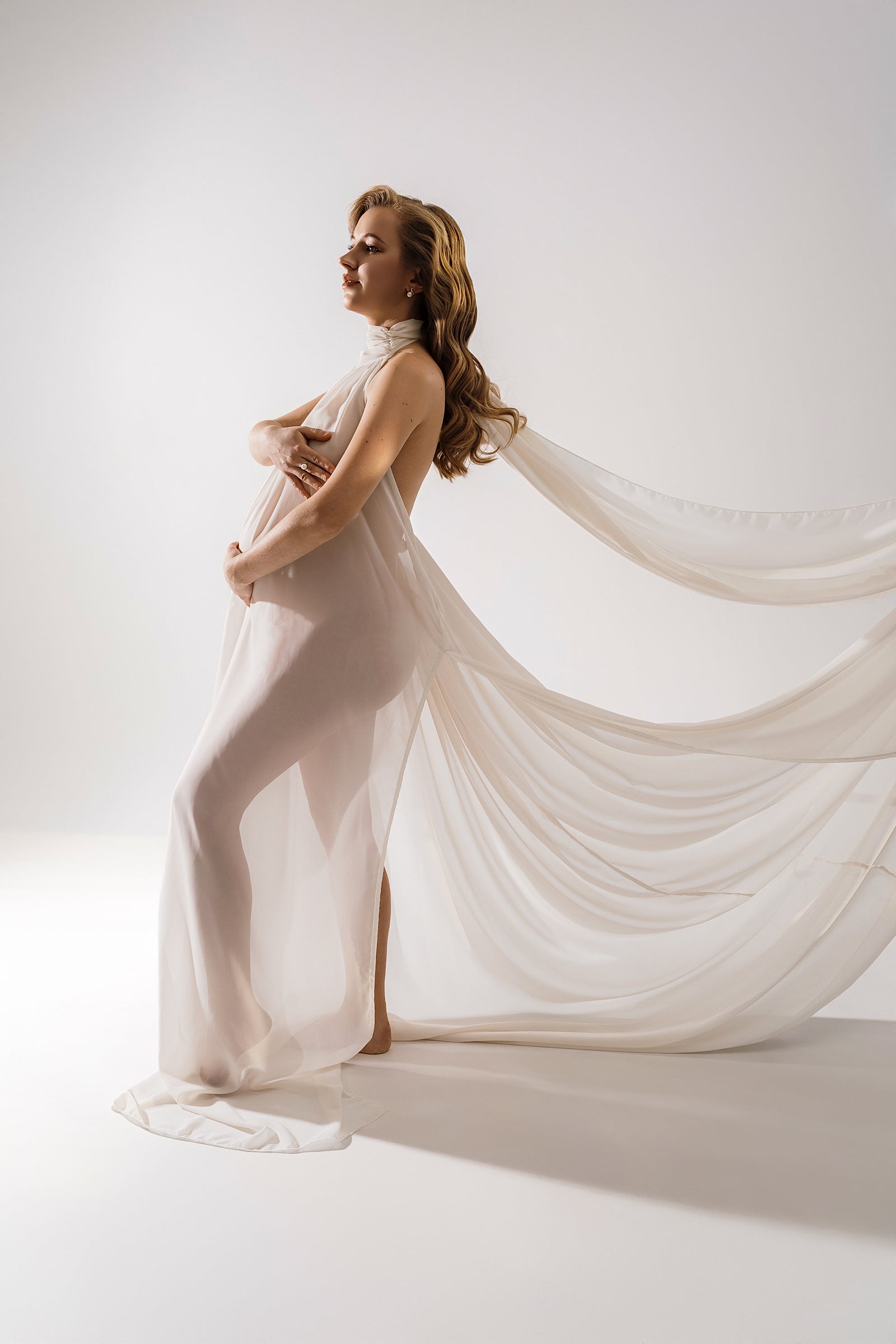 Transparentna, delikatna suknia ciążowa Aura stworzona specjalnie do artystycznych sesji zdjęciowych. Wykonana z subtelnie prześwitującego, zwiewnego materiału w odcieniu mlecznej bieli, pięknie eksponuje sylwetkę przyszłej mamy. Jej wysoki kołnierz oraz lekka konstrukcja zapewniają wyjątkowy efekt, podkreślając kobiecość, naturalność i wyjątkowość momentu oczekiwania na dziecko. Idealnie sprawdzi się podczas profesjonalnych sesji fotograficznych, uwieczniając ten magiczny czas w niezwykły sposób.